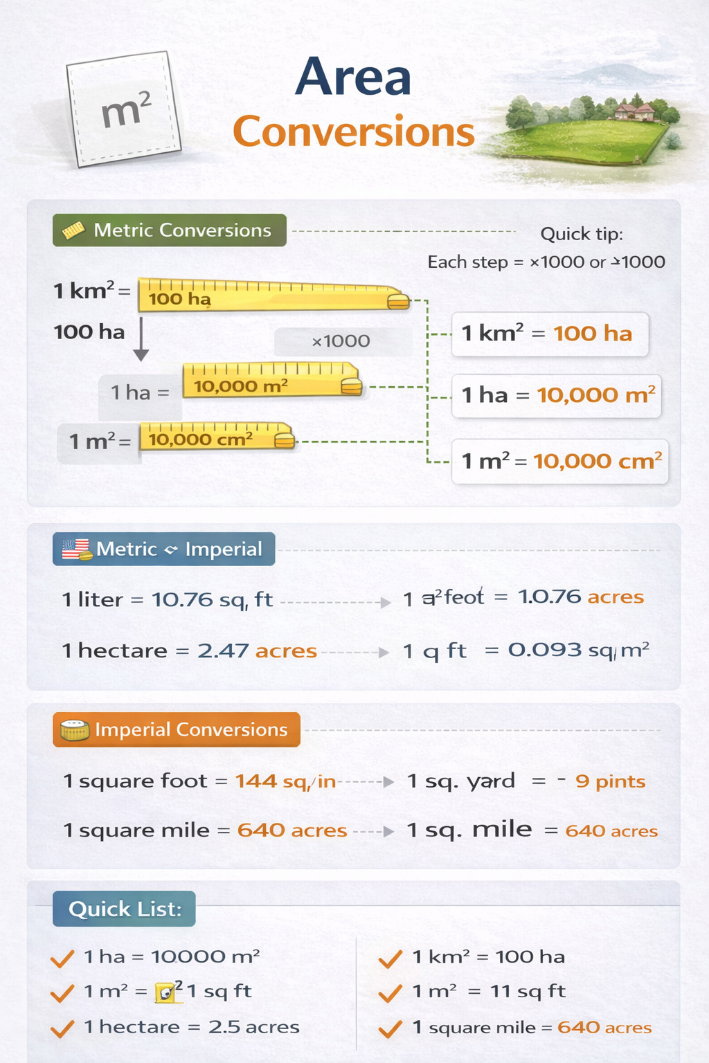Area conversion allows users to convert square units such as square meters, square feet, and acres. It is important in construction and real estate.